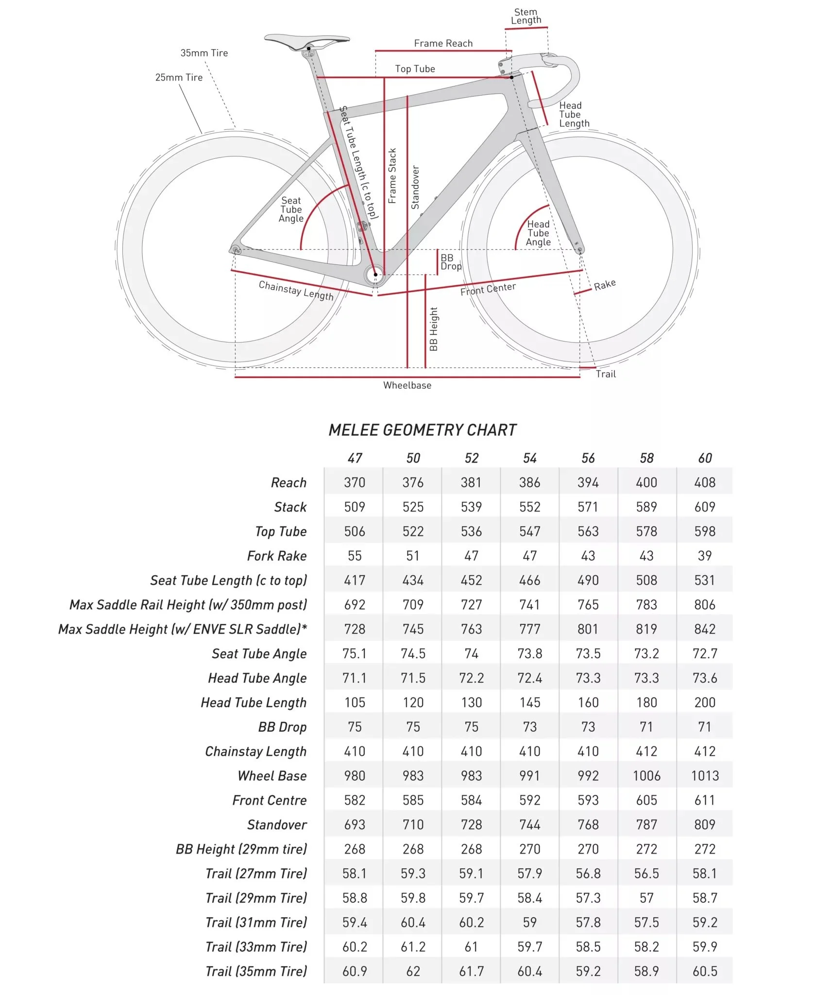 The Melee takes design cues from ENVE’s Custom Road, but where the Custom Road prioritizes customization, the Melee prioritizes efficiency and speed. With geometry and handling characteristics optimized for 27 to 32 mm tires, the Melee is a modern road race bike engineered to provide the performance competitive riders demand. The Melee performs in all the areas that count – efficient power transmission, weight, aerodynamics and versatility. To achieve the versatility today’s road racers require, the Melee provides riders with up to 35 mm of tire clearance.